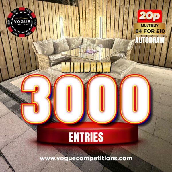 You may enter the competition online or for free by post by sending your entry to VOGUE CAR SALES LTD T/A VOGUE COMPETITIONS on a postcard. You must have an account on VOGUE CAR SALES LTD T/A VOGUE COMPETITIONS for your entry to be processed. All details on your entry MUST correspond to the details on your account to receive the order confirmation and ticket number. Postal entries received without a registered account cannot be processed.