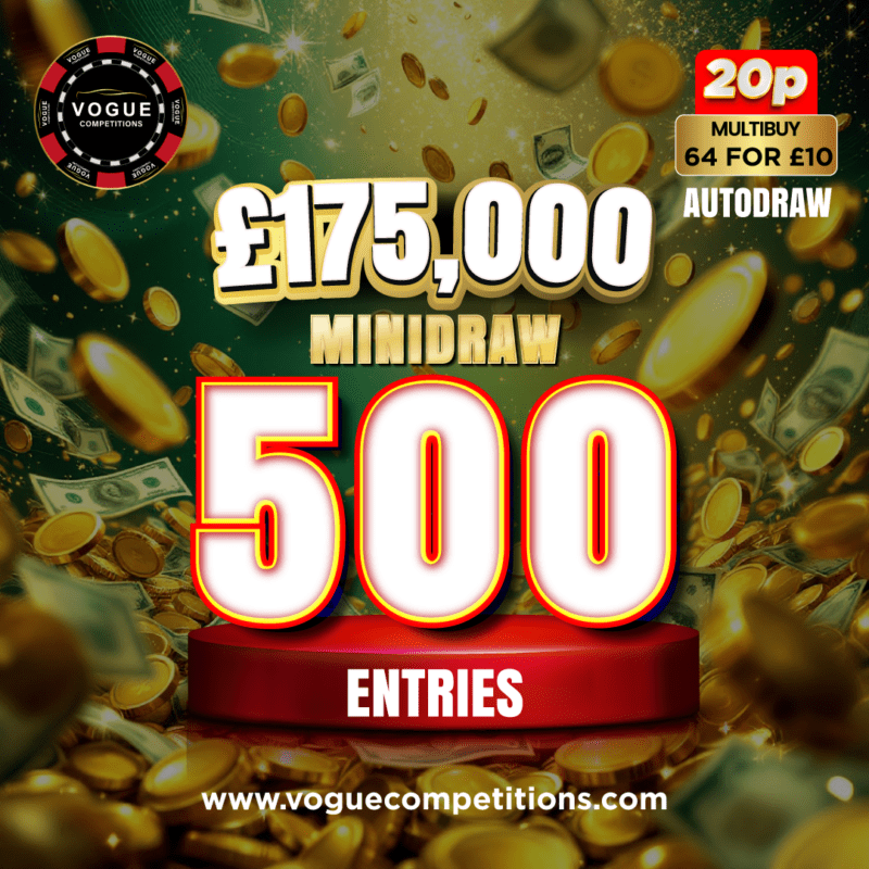 You may enter the competition online or for free by post by sending your entry to VOGUE CAR SALES LTD T/A VOGUE COMPETITIONS on a postcard. You must have an account on VOGUE CAR SALES LTD T/A VOGUE COMPETITIONS for your entry to be processed. All details on your entry MUST correspond to the details on your account to receive the order confirmation and ticket number. Postal entries received without a registered account cannot be processed.