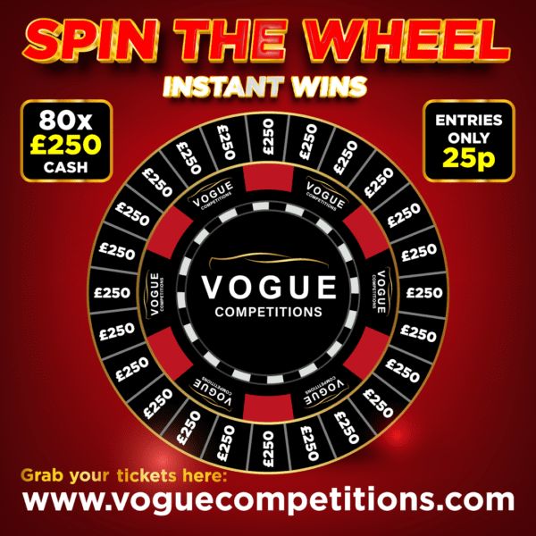 You may enter the competition online or for free by post by sending your entry to VOGUE CAR SALES LTD T/A VOGUE COMPETITIONS on a postcard. You must have an account on VOGUE CAR SALES LTD T/A VOGUE COMPETITIONS for your entry to be processed. All details on your entry MUST correspond to the details on your account to receive the order confirmation and ticket number. Postal entries received without a registered account cannot be processed.