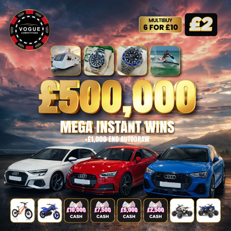 You may enter the competition online or for free by post by sending your entry to VOGUE CAR SALES LTD T/A VOGUE COMPETITIONS on a postcard. You must have an account on VOGUE CAR SALES LTD T/A VOGUE COMPETITIONS for your entry to be processed. All details on your entry MUST correspond to the details on your account to receive the order confirmation and ticket number. Postal entries received without a registered account cannot be processed.